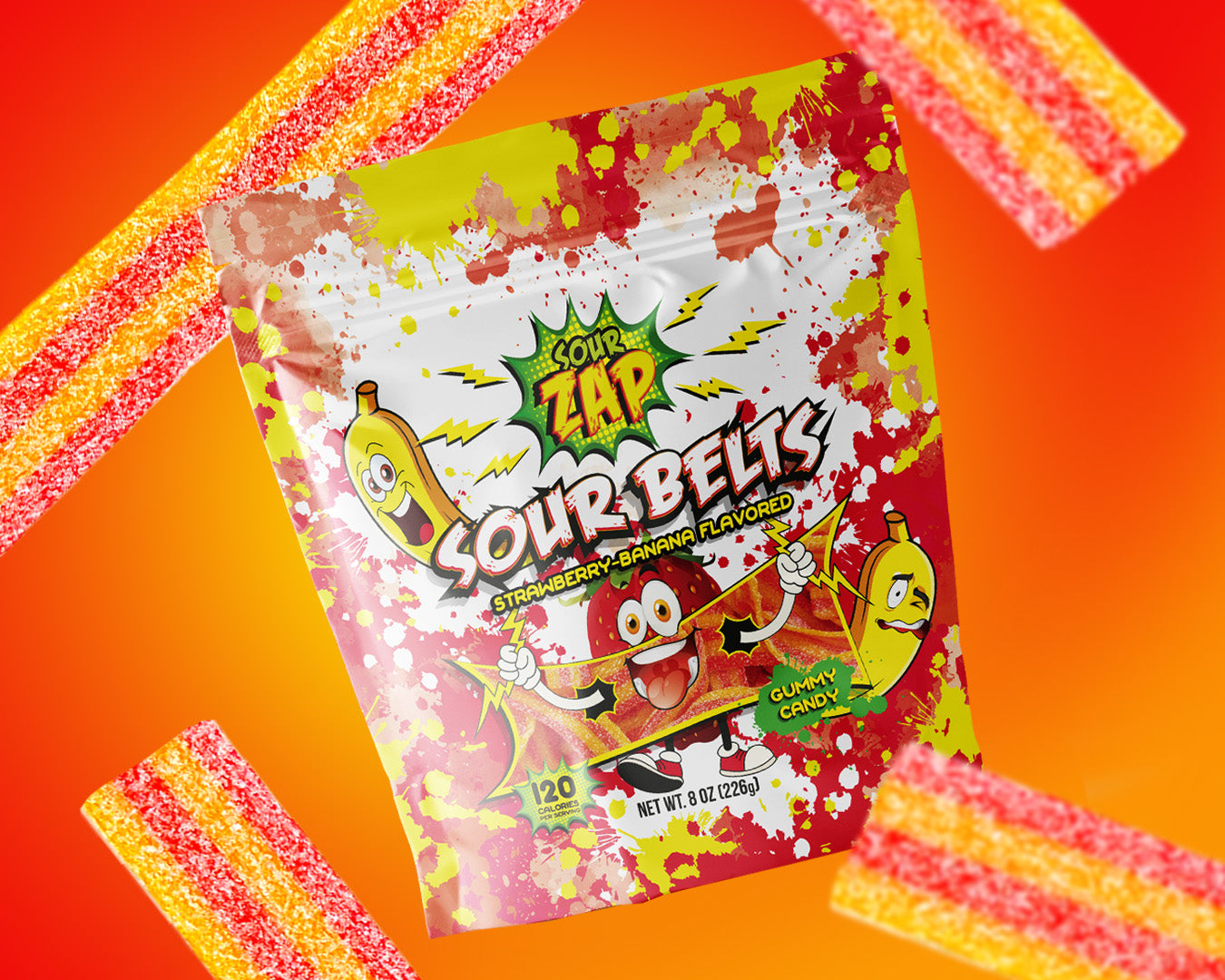 Tangy strawberry meets creamy banana in chewy sour belts — colorful, creative, and perfect for snacking or adding a playful twist to any dessert